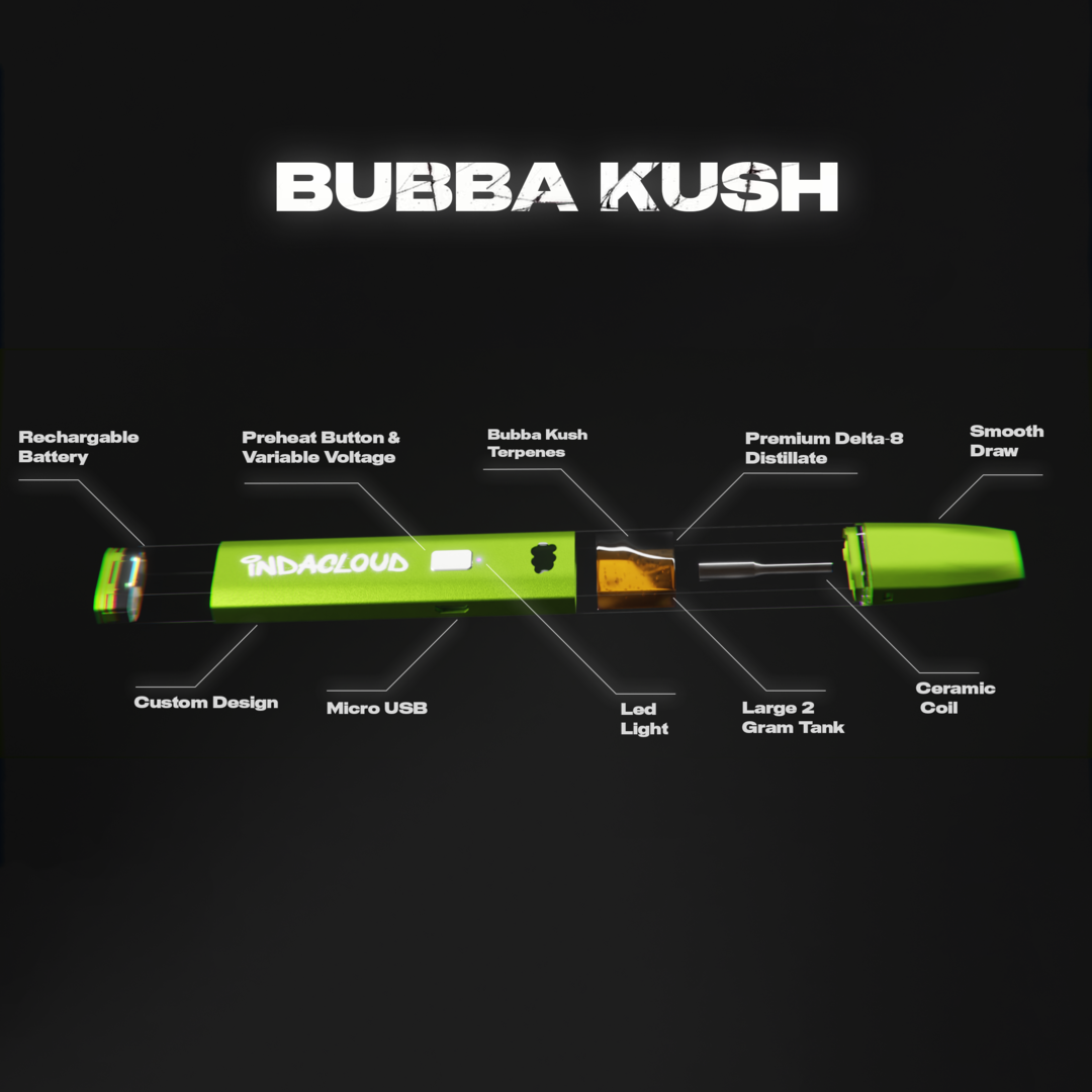 Indacloud's Bubba Kush Delta 8 Disposable Vape Pen promises an enriching taste profile that matches its incredible effects. A puff of this vape pen will introduce your palate to a robust flavor ensemble dominated by earthy tones and punctuated by notes of chocolate, coffee, and diesel. These flavors have been carefully curated to enhance your vaping experience, creating a multi-dimensional sensory journey. This vape pen's rich, sophisticated palette makes it a perfect choice for individuals looking for a bit more than the conventional vaping experience. You'll enjoy the immediate effects of Delta 8 THC and appreciate the unique, layered flavor profile that sets Bubba Kush apart.