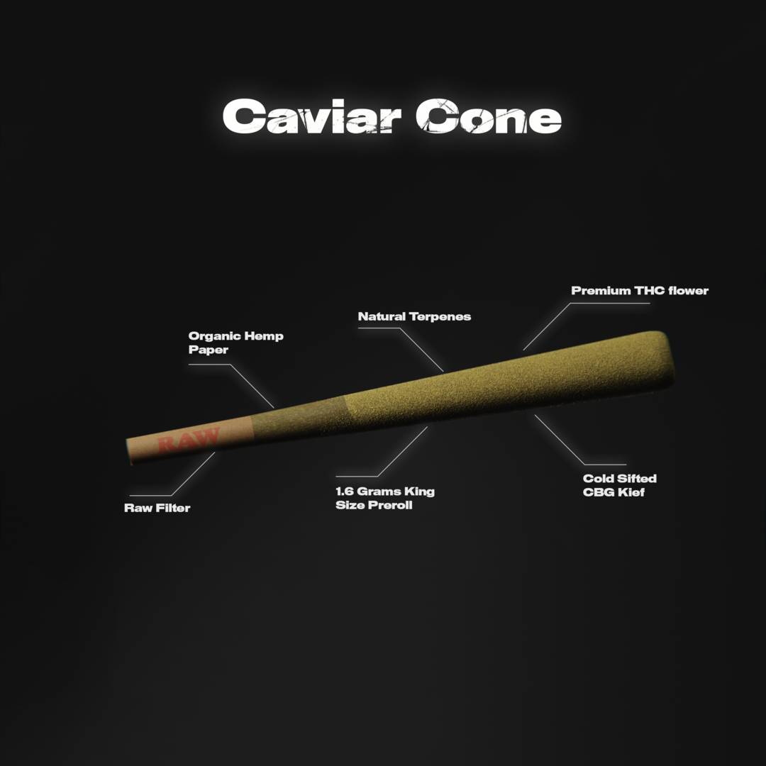 The classic of classics, a Caviar Cone is smoking like royalty. This is the ultimate smoking experience combining our premium THCA flower and terpenes, then coated in CBG kief. We put two huge 1.6 gram Caviar Cones in each package that are ready to be lit up and smoked. The added kief is what gives this pre-roll an extra layer of something special, making it more potent and surprisingly smooth.