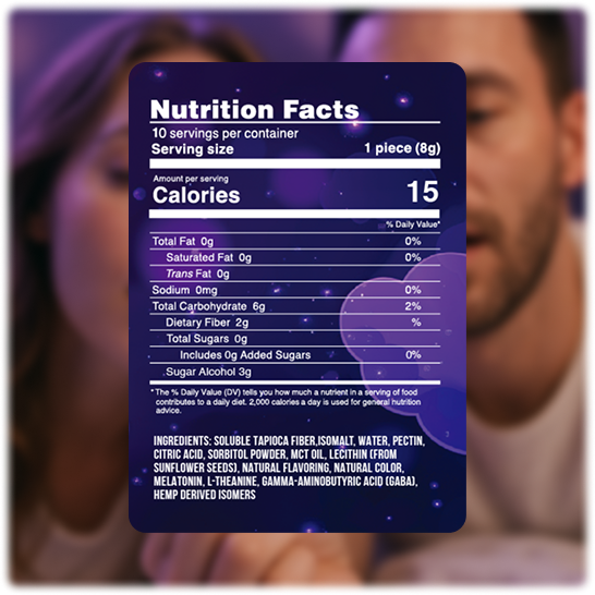 5mg THC, 3mg Melatonin, 10mg CBN, 100mg l-theanine, 25mg GABA