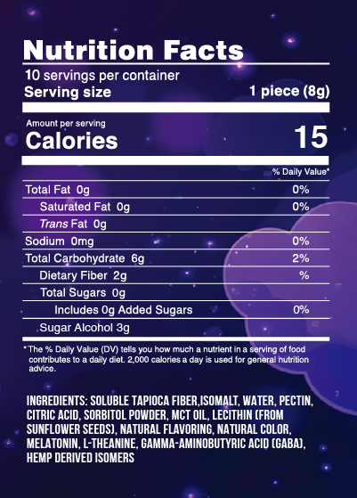 5mg THC, 3mg Melatonin, 10mg CBN, 100mg l-theanine, 25mg GABA